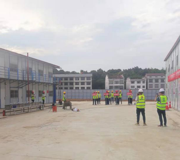 培訓結束后,谷城一中項目安質部部長王海波組織項目施工人員模擬可能出現的緊急安全事故現場,進行應急演練展示。